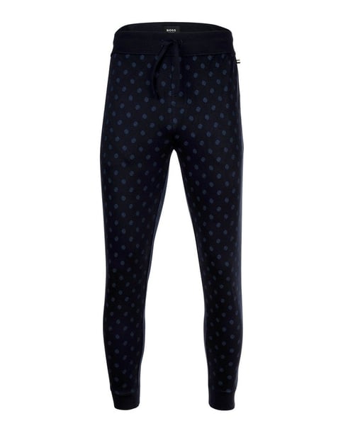 Pyjama Set für Herren von der Marke BOSS. Einfarbiges Langarmshirt mit kleinem Logo auf der Brust. Gemusterte Schlafhose. Schlafanzug aus reiner Baumwolle.