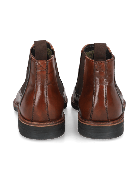 Kurze Chelsea-Stiefel der Merlo-Gruppe sind in Cognacbraun gehalten und weisen eine raffinierte, zweifarbige Handarbeit mit Pflegeimprägnierung auf, das ihnen einen unverwechselbaren Charme verleiht. Diese Herrenstiefel sind mit einer breiten Leiste gefertigt, die einen erstaunlichen Komfort und eine perfekte Passform gewährleistet. Sie sind aus hochwertigem Leder gefertigt, haben eine glatte Textur und sind bei richtiger Pflege auch nach mehrmaligem Tragen langlebig.