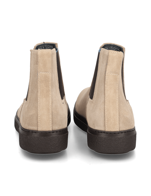 Der beige Chelsea Boot von D.H.POLLAK setzt auf dezente Modernität bei gleichzeitiger Wahrung klassischer Werte. Das hochwertige Veloursleder in elegantem Beige bringt frischen Wind in die Garderobe des stilbewussten Herrn. Die charakteristischen elastischen Seiteneinsätze in kontrastierendem Dunkelbraun setzen dezente Akzente und garantieren komfortables Handling. Das herausnehmbare Wechselfußbett bietet individuellen Tragekomfort, während die durchgehende Lederinnenfütterung für optimales Fußklima sorgt. Mit seiner hellen Farbgebung und der robusten dunklen Profilsohle verkörpert dieser Stiefel legere Eleganz für den Kenner, der Qualität mit subtiler Individualität verbindet.