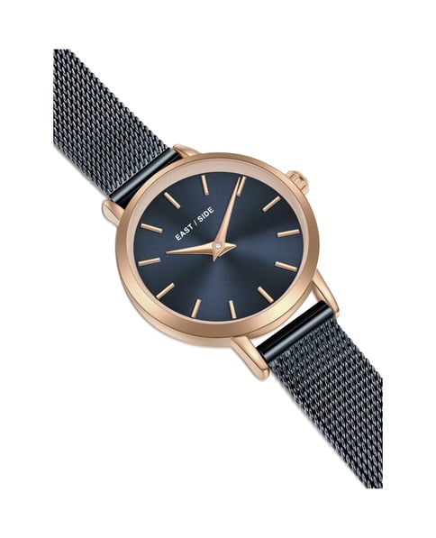 Sie wünschen sich eine raffinierte Uhr mit Stil? Dieses Modell des jungen Labels EASTSIDE ist ein Must-Have für weibliche Uhrenfans, die Schmuck mit Upperclass-Vibes mögen. Ein schlichtes, rundes Gehäuse mit Roségold-Plattierung umrahmt ein dunkles Zifferblatt mit dezenten Strichindizes und edlen Dauphinzeigern. Raffinesse am Handgelenk bietet das robuste Milanaise-Armband aus IP-veredeltem Edelstahl mit filigraner Mesh-Optik, farblich perfekt abgestimmt auf das Zifferblatt.