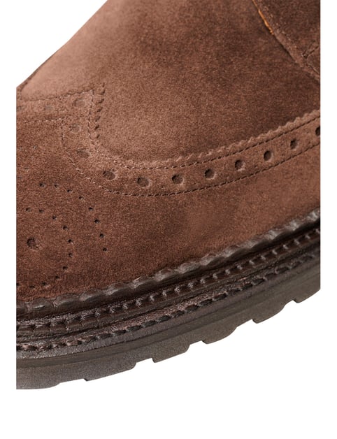 Anmutig, stabil und ausgesprochen bequem kommt das Modell Winston FBDB1 von Henry Stevens daher. Die Berliner Schuhmarke richtet sich an alle Menschen, die ihr Stilbewusstsein neu interpretieren möchten. Die klassisch rahmengenähten Full-Brogue Derby Boots mit Triple Welt mit offener Schnürung in Rotbraun oder Dunkelbraun sind das Erzeugnis eines jahrhundertealten Traditionshandwerks, welches eine anspruchsvolle Optik, höchsten Tragekomfort, außergewöhnliche Langlebigkeit und bei Bedarf eine leichte Reparatur garantiert. Handgefertigt aus samtigem Velours-Leder, handelt es sich bei dem Modell Winston FBDB1 mit einer stabilen Gummiprofilsohle und aufwendigem Dreifachrahmen um einen atmungsaktiven Volllederschuh auf dem komfortablen Winston Leisten. Als klassische Herrenstiefel sind die Full-Brogue Derby Boots mit Triple Welt zweifellos die optimale Begleitung für eine Vielzahl an Looks. Ganz gleich, ob zu modernen Business-Outfits oder einer legeren Freizeitgarderobe – das Modell Winsto