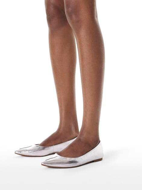 Silberne Ballerinas aus hochwertigem Narbenleder zeichnen sich durch Langlebigkeit und außergewöhnlichen Tragekomfort aus. Spitz zulaufende Nasen verleihen ihnen einen zarten, subtilen Charakter, der die weibliche Anmut unterstreicht. Das schön profilierte Obermaterial ist mit einer konvexen Längsnaht verziert, die den Fuß optisch verschlankt. Die silberne Farbe lässt die Schuhe originell und ungewöhnlich aussehen. Flache Ballerinas passen perfekt sowohl zu eleganten Kleidern als auch zu klassischen Hosen oder Röcken.