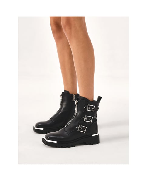 Die aus Naturleder gefertigten Stiefel haben ein avantgardistisches Design. Sie haben eine schlichte Sohle mit Profil, die ausreichend Halt und Stabilität bietet. Die quadratische, mit einem Metallornament verzierte Zehenkappe verleiht ihnen einen modernen und unverwechselbaren Charakter. Der knöchellange Schaft, der mit einem Reißverschluss versehen ist, ermöglicht ein einfaches An- und Ausziehen der Schuhe. Zusätzlich ist der Schaft mit Reißverschlüssen auf der Vorderseite und Schnallen an den Seiten verziert, was den avantgardistischen Stil unterstreicht. Diese Stiefel vereinen Funktionalität und einen modischen Look und passen perfekt zu den aktuellen Schuhtrends.Das Futter aus weichem Semianilin-Schafsleder garantiert einen hohen Tragekomfort, während das Futter aus Stoffpelz an kälteren Tagen für ein Gefühl der Wärme sorgt.