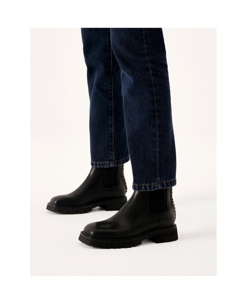 Die Chelsea-Boots zum Hineinschlüpfen mit dicker Sohle bestechen durch eine abgeschnittene Nase und eine Metallkette, die den hinteren Teil des Schaftes ziert. Dieses markante Modell passt sowohl zu kräftigen Rock-Kombinationen als auch zu alltäglicher Freizeitkleidung. Das Schuhwerk ist aus glattem, genarbtem Leder in schwarzer Farbe gefertigt. Die nicht isolierten Stiefel sind eine zeitlose und vielseitige Wahl für jede Jahreszeit.Das Futter aus Semianilin-Schafsleder sorgt dank seiner hervorragenden Feuchtigkeitsaufnahme für außergewöhnlichen Komfort.