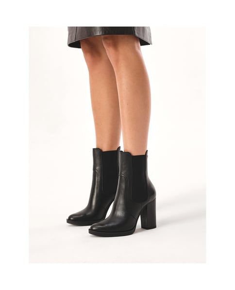 Schwarze Stiefel mit hohem Stiletto-Absatz aus Naturleder sind elegante und anspruchsvolle Schuhe. Das hochwertige Leder sorgt für einen luxuriösen Look und Strapazierfähigkeit, während der Pfostenabsatz der Silhouette Höhe verleiht und gleichzeitig Stabilität und Komfort bietet. Der Schaft zum Hineinschlüpfen mit elastischen Einsätzen an den Seiten erleichtert das Anziehen und sorgt für einen perfekten Sitz. Die teilweise isolierte Innenausstattung macht sie auch an kälteren Tagen bequem. Diese Stiefel passen sowohl zu legeren als auch zu eleganten Outfits und bieten Vielseitigkeit und Komfort.Das Futter aus weichem Ziegenleder garantiert einen hohen Tragekomfort, während das Futter aus Stoffpelz an kalten Tagen für ein Gefühl der Wärme sorgt.