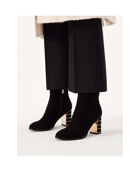 Zipperboots mit einem einfachen, schlanken Schnitt sind ein vielseitiges und zeitloses Modell. Sein minimalistischer Stil wird durch ein elegantes Metallelement an der Ferse bereichert. Horizontale Goldstreifen sorgen für einen interessanten optischen Effekt. Schwarze Stiefel aus weichem Veloursleder passen sowohl zum lässigen als auch zum gelegentlichen Ausgeh-Styling.Das Futter aus weichem Ziegenleder Semianilin garantiert einen hohen Tragekomfort, und das Futter aus Stoffpelz sorgt für ein Gefühl der Wärme an kälteren Tagen.