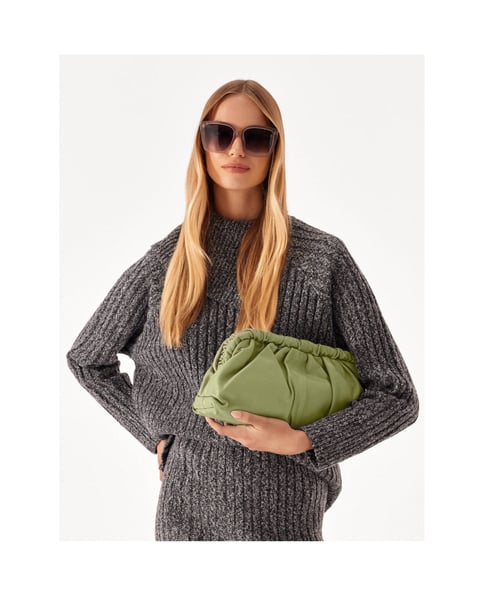 Die Tasche aus Oberleder ist mit einem Metallrahmen ausgestattet, der ihre Form definiert und als Verschluss dient. Dank ihm sieht dieses Modell schön aus, wenn es in der Hand gehalten wird, und die abnehmbare Kette macht es möglich, es auch über der Schulter zu tragen. Das weiche, gekräuselte Leder lässt die Handtasche optisch an eine Wolke erinnern und macht ihre Benutzung sehr angenehm.Einzelheiten zum Produkt:Die Handtasche hat 1 Fach, das mit einem Metallrahmen geschlossen wird.Innen befindet sich 1 Reißverschlussfach.Die Tasche ist mit einer abnehmbaren, nicht verstellbaren Kette ausgestattet.
