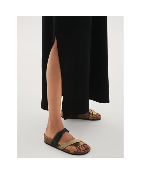 Schwarz-goldene Damen-Pantoletten aus hochwertigem , genarbtem Leder mit auffälligem Design.Das goldene Farbschema in Kombination mit Schwarz passt zu den meisten Styles und setzt einen glänzenden Akzent.Die Textur des mittleren Riemens zeigt das in dieser Saison besonders modische Schlangenhautmotiv.Die Keilabsätze heben die Figur attraktiv hervor.Die Unterseite der Riemen ist besonders weich und sorgt für ein angenehmes Tragegefühl.