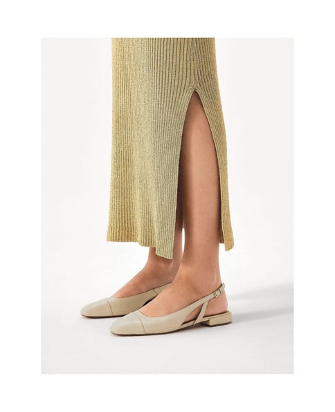 Cremefarbene Pumps aus hochwertigem Naturleder sind eine elegante und dezente Wahl, die jedem Styling Leichtigkeit verleiht. Das Modell mit flacher Sohle und offenem Absatz bietet Komfort und Atmungsaktivität, perfekt für wärmere Tage. Der mit einer goldenen Schnalle verschlossene Riemen stabilisiert nicht nur den Fuß, sondern setzt auch einen zarten, luxuriösen Akzent, der schön mit dem hellen Farbton des Leders kontrastiert. Die runde, überlappende Nase unterstreicht die klassische Eleganz der Schuhe, während das fein geschnittene Obermaterial an den Seiten einen modernen und einzigartigen Touch verleiht. Die vorgestellten Pumps sind eine perfekte Ergänzung sowohl für den Alltag als auch für ein anspruchsvolles Styling.Die Laufsohle aus Thunfischleder zeichnet sich durch Strapazierfähigkeit und ästhetisches Aussehen aus.Das Futter aus Semianilin-Schafsleder sorgt dank seiner hervorragenden Feuchtigkeitsaufnahme für außergewöhnlichen Komfort.