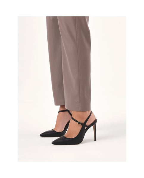 Schwarze Pumps aus hochwertigem Naturleder sind ein elegantes und sinnliches Schuhwerk, das Klassiker mit modernen Akzenten verbindet. Das ausgeschnittene Obermaterial legt den Fuß dezent frei und verleiht den Schuhen einen leichten und schicken Look. Um den Knöchel herum befindet sich ein zartes Riemchen, das mit einer goldenen Schnalle geschlossen wird. Das verleiht dem Ganzen einen raffinierten Charme und sorgt dafür, dass die Pumps sicher am Fuß bleiben, während sie Stabilität gewährleisten. Der hohe, schlanke Stiletto verleiht Höhe und betont die Silhouette, wodurch eine elegante Haltung von außergewöhnlicher Anmut entsteht. Die für dieses Modell typische spitze Nase verlängert optisch das Bein und verleiht den Schuhen einen unverwechselbaren, modernen Charakter. Die Kombination von goldenen Details mit klassischem Schwarz erzeugt eine zeitlose, luxuriöse Wirkung, ideal sowohl für Abendausflüge als auch für formellere Anlässe, bei denen Eleganz und Raffinesse im Vordergrund stehen