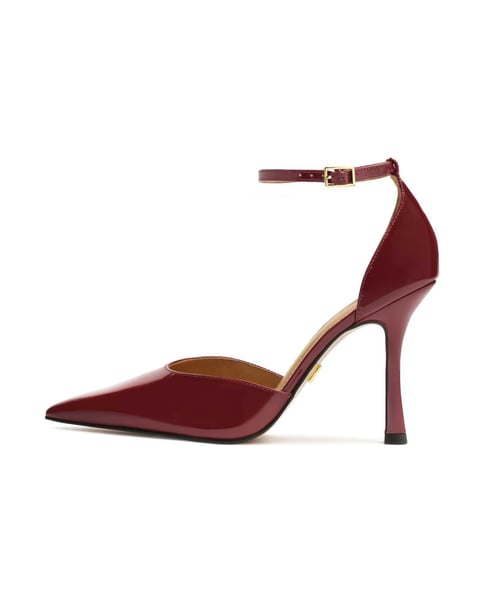 Slingbackpumps mit offenem Absatz aus bordeauxfarbenem Lackleder sind ein markantes und stilvolles Modell, ideal für besondere Anlässe. Eine strukturierte Vorderseite mit einer verlängerten, gerade geschnittenen Nase verleiht den Schuhen einen eleganten, modernen Look. Das lackierte Leder in einem tiefen Kastanienbraunton sorgt für einen luxuriösen Glanz und zieht mit seiner raffinierten Ästhetik die Aufmerksamkeit auf sich. Ein offenes Riemchen sorgt für einen perfekten Sitz, während ein ungewöhnlich hoher Absatz mit einer einzigartigen Form Charakter verleiht und die Originalität des Designs unterstreicht. Diese Pumps sind eine Kombination aus Eleganz und unverwechselbarem Stil, die sich perfekt für Abend- und formelle Outfits eignet.Die Sohle aus tunesischem Leder zeichnet sich durch Langlebigkeit und Ästhetik aus.Das Futter aus feinem Semianilin-Schafsleder sorgt dank seiner hervorragenden Feuchtigkeitsaufnahme für außergewöhnlichen Komfort.