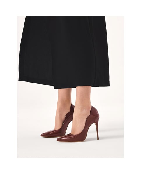Kastanienbraune Pumps aus hochwertigem Lackleder strahlen Eleganz und Raffinesse aus. Ihr tiefer, satter kastanienbrauner Farbton zieht die Aufmerksamkeit auf sich und verleiht Ihrem Styling einen luxuriösen und sinnlichen Touch. Das Lackleder verleiht ihnen einen subtilen Glanz, der ihren raffinierten Charakter unterstreicht und ihnen einen Hauch von Eleganz verleiht. Das dekorative Obermaterial ist mit einem gewellten Rand versehen, der der klassischen Form des Schuhs einen subtilen, romantischen Touch verleiht und ihm gleichzeitig Originalität und Zartheit verleiht. Der schmale, hohe Stilettoabsatz verleiht den Schuhen Weiblichkeit und verlängert die Silhouette optisch. Die spitz zulaufende Schuhspitze verleiht dem Gesamtbild eine raffinierte, klassische Note, die einen eleganten Look mit einem modernen Stil perfekt ausbalanciert. Es handelt sich um außergewöhnliche Pumps, die sich sowohl für elegante Abendgarderobe als auch für formellere Anlässe eignen und Bewunderung und Vertraue