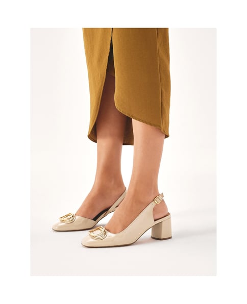 Äußerst elegante und stilvolle beigefarbene Pumps aus Lackleder ziehen mit Sicherheit die Aufmerksamkeit jeder Frau auf sich, die ihr einzigartiges Styling unterstreichen möchte. Die Vorderseite der Pumps ist mit einem Metallornament verziert, das ihren einzigartigen Charakter unterstreicht und sie optisch äußerst attraktiv macht. Der offene Absatz verleiht ihnen Leichtigkeit und Subtilität, während er die Schönheit des Fußes zur Geltung bringt. Der niedrige Stiletto-Absatz sorgt für Stabilität und Komfort beim Gehen und eignet sich sowohl für den Alltag als auch für besondere Anlässe, denn er passt perfekt zu einer Vielzahl von Stylings, von klassisch bis avantgardistisch. Zweifellos sind sie ein unverzichtbarer Bestandteil des Kleiderschranks jeder modischen Frau. Der Tragekomfort wird durch das Futter aus hochwertigem semianilinem Ziegenleder garantiert.