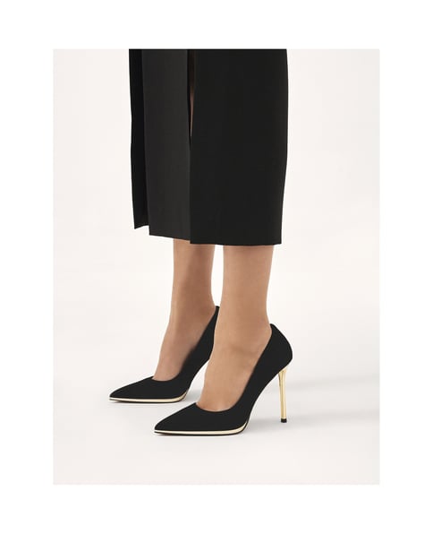 Eleganz und Modernität treffen in diesen raffinierten schwarzen Wildlederpumps aufeinander, die ein Symbol für kompromisslosen Stil sind. Aus hochwertigem Veloursleder gefertigt, bieten sie sowohl einen luxuriösen Look als auch einen überdurchschnittlichen Tragekomfort. Die schärferen Linien der spitzen Schuhspitze verleihen den Schuhen Charakter und Kühnheit und schaffen ein dynamisches Profil, das sich perfekt mit formellen und abendlichen Outfits kombinieren lässt. Im Kontrast zum schwarzen Wildleder ist der hohe Absatz in Gold nicht nur ein phänomenales Designelement, sondern auch ein Ausdruck von Kühnheit und außergewöhnlichem Geschmack.Außergewöhnlichen Komfort garantiert das Futter aus Semianilin-Schafsleder, das den Vorteil einer erhöhten Feuchtigkeitsaufnahme hat.Die Laufsohle aus Thunfischleder garantiert Haltbarkeit, Festigkeit und Ästhetik der Schuhe.