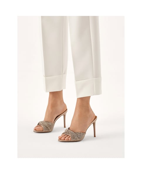 Schicke Pantoletten auf einem schmalen Absatz sind ein formeller Vorschlag, der durch sein umwerfendes Dekor besticht. Der breite, gedrehte Riemen ist mit feinen silberfarbenen Zirkonia besetzt, die das Licht reflektieren und streuen. Die eleganten, funkelnden Pantoletten sind ein schmückendes Accessoire zu gelegentlichen, formellen Outfits. Das beigefarbene, satinierte Gewebe verleiht den Schuhen einen neutralen, vielseitigen Touch.Außergewöhnlicher Komfort wird durch das Futter aus Semianilin-Schafsleder garantiert, das den Vorteil einer verbesserten Feuchtigkeitsaufnahme bietet.Die Microlite-Sohle garantiert die Haltbarkeit, Festigkeit und Ästhetik der Schuhe.