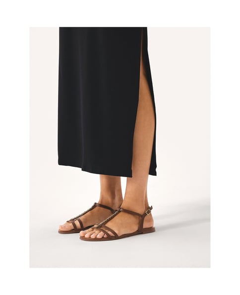 Diebraunen Flachsandalen sind eine außergewöhnliche Wahl für alle, die Eleganz und Komfort zu schätzen wissen. Sie sind aus hochwertigem Naturleder gefertigt und verfügen über ein dezentes, aber raffiniertes Design, das jedes Styling unterstreicht. Der Verschluss um den Knöchel sorgt für einen perfekten Sitz und Stabilität beim Gehen. Das wichtigste dekorative Element ist ein vertikaler Riemen, der mit einer zarten Goldkette verziert ist und dem Ganzen einen luxuriösen Touch verleiht. Darüber hinaus stützen zwei dünne Riemchen dezent die Zehen und unterstreichen die Leichtigkeit und Eleganz des Schnitts.Das Futter aus Naturleder sorgt für Komfort und Bequemlichkeit
