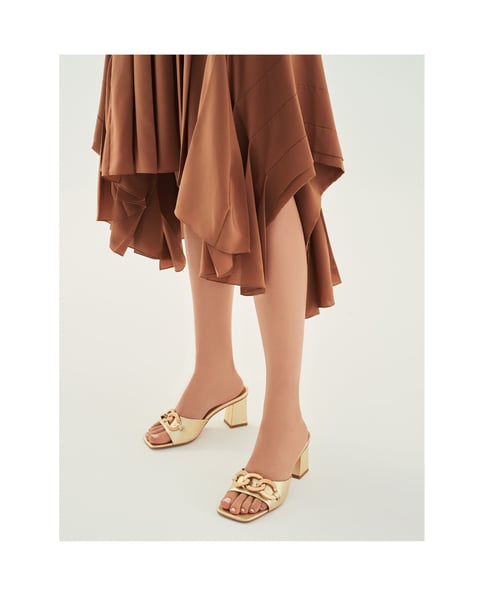 Pantoletten mit mittelhohem Absatz sind ein attraktiver Vorschlag für Frauen, die eine interessante Alternative zu eleganten Sandalen und Pumps suchen. Die Schuhe sind aus glattem , genarbtem Leder in goldener Farbe gefertigt, das perfekt mit der großen Metallverzierung harmoniert. Diese Flip-Flops sind perfekt für besondere Anlässe. Ihr eleganter Stil wird eine interessante Ergänzung zur Abendgarderobe sein.Die Microlite-Sohle zeichnet sich durch Langlebigkeit und Ästhetik aus.Das Futter aus Semianilin-Schafsleder sorgt dank seiner außergewöhnlichen Feuchtigkeitsaufnahme für außergewöhnlichen Tragekomfort.