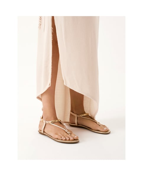 DieSandalen im Stil von Flip-Flops mit flacher Sohle sind ein attraktiver Schnitt, der am Bein sehr subtil und zart wirkt. Die goldene Farbe unterstreicht ihren femininen Charakter und ihr elegantes Styling. Die Riemen aus besonders hochwertigem , genarbtem Leder , die über den Mittelfuß und um den Knöchel verlaufen, sorgen für einen interessanten optischen Effekt. Eine goldene Metallverzierung lockert den Minimalismus auf.Das Innenfutter aus Semianilin-Schafsleder bietet dank seiner extremen Weichheit und seiner hervorragenden Feuchtigkeitsaufnahme einen außergewöhnlichen Komfort.