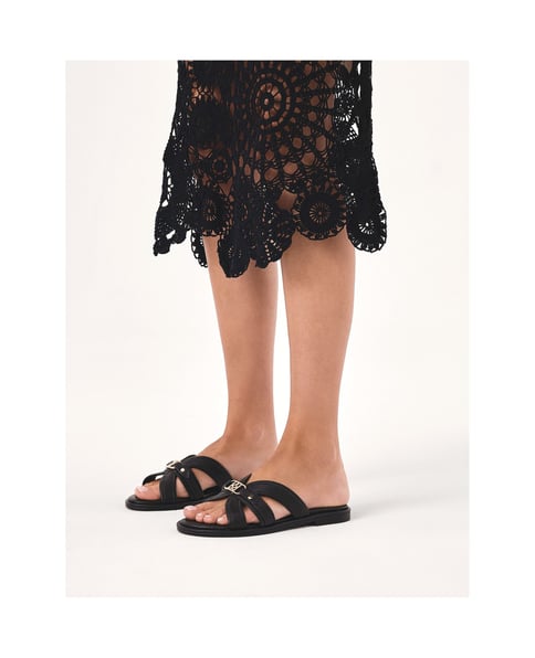 Schwarze Pantoletten aus hochwertigem Naturleder sind die Quintessenz von Eleganz und Minimalismus. Ihr Design basiert auf einer flachen Sohle, die für Komfort beim täglichen Tragen sorgt. Breite, halbkreisförmig angeordnete Riemen verleihen ihnen einen modernen Charakter und passen sich gleichzeitig perfekt dem Fuß an. Das Herzstück der Pantoletten ist ein goldenes Metallornament in Form des KAZAR-Monogramms, das die Blicke auf sich zieht und dem Ganzen einen luxuriösen Touch verleiht. Dies ist die perfekte Wahl für warme Tage, wenn Sie Stil mit Komfort verbinden möchten.Für hohen Tragekomfort sorgt das Futter aus weichem Semianilin-Naturleder.