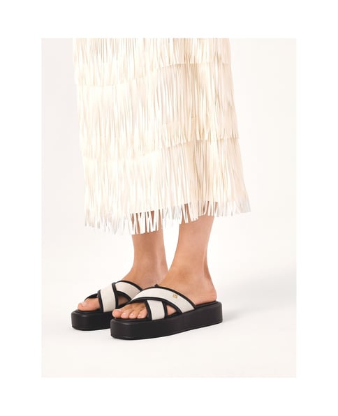 Die schwarzen Pantoletten sind moderne Schuhe mit einem eleganten und zugleich lässigen Stil. Sie sind aus hochwertigem Naturleder und strapazierfähigem Canvas-Gewebe gefertigt und bieten eine harmonische Kombination aus klassischem Schwarz und dezentem Beige als Kontrast. Die dicke Sohle verleiht ihnen einen modernen Touch und garantiert einen hohen Tragekomfort. Die sich kreuzenden Riemen erzeugen ein dynamisches Muster, das sich schön an den Fuß schmiegt. Das goldene KAZAR-Monogramm auf einem der Riemen ist ein luxuriöser Akzent, der die Aufmerksamkeit auf sich zieht und den Flip-Flops einen raffinierten Stil verleiht. Eine perfekte Wahl für Sommertage, die Komfort und Eleganz verbindet.Für hohen Tragekomfort sorgt das Futter aus weichem Semianilin-Naturleder.
