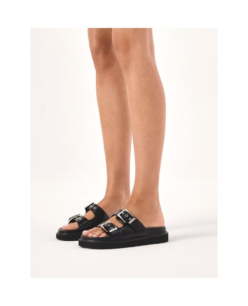 Schwarze Pantoletten aus hochwertigem Naturleder mit Anilin-Finish sind ein luxuriöses Material, das für seine hohe Qualität, Eleganz und sein natürliches Aussehen geschätzt wird. Es handelt sich um Glattleder, das sich durch einen dezenten Glanz auszeichnet, der durch die Anilin-Behandlung entsteht und die natürlichen Eigenschaften des Leders unterstreicht. Die Pantoletten verfügen über einen breiten Riemen, der für einen stabilen Halt am Fuß sorgt, und zwei Schnallen, die den Pantoletten einen klassischen, aber modernen Look verleihen. Die Schnallen lassen sich verstellen und sorgen so für eine perfekte Anpassung an den Fuß. Die bequeme, konturierte Innensohle ist auf Komfort ausgelegt - sie passt sich der Form des Fußes an und bietet beim Tragen Halt. Die dicke Sohle verleiht den Pantoletten einen modernen Touch und bietet gleichzeitig eine gute Dämpfung, so dass die Schuhe sowohl für den Alltag als auch für längere Spaziergänge geeignet sind.