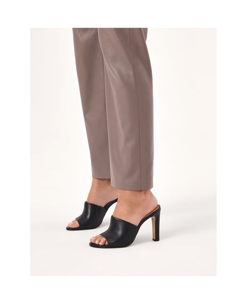 Schwarze Pantoletten aus hochwertigem Naturleder sind eine elegante und zeitlose Wahl für Liebhaberinnen eines ausgeprägten Stils. Auf einem dickeren Stilettoabsatz kombiniert sie Stabilität mit femininer Eleganz. An der Vorderseite befindet sich ein breiter Riemen, der für Komfort und guten Halt des Fußes sorgt und den Schuhen gleichzeitig Charakter verleiht. Ideal sowohl für die Abendgarderobe als auch für elegante Sommeroutfits.Das Futter besteht aus weichem Semianilin-Schafsleder, das sich durch eine hervorragende Feuchtigkeitsaufnahme auszeichnet und einen hohen Tragekomfort garantiert.Die Sohle ist aus Thunfischleder gefertigt, das sich durch Langlebigkeit und Ästhetik auszeichnet.