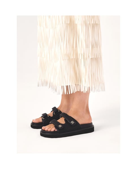 Schwarze Pantoletten aus hochwertigem geprägtem Leder sind die perfekte Kombination aus Komfort und Eleganz. Ihr minimalistisches Design, angereichert mit zwei breiten Klettverschlussriemen, passt perfekt zu einem informellen, aber schicken Stil. Die goldenen KAZAR-Monogramme an den Enden der Riemen verleihen einen subtilen Luxus, der den prestigeträchtigen Charakter der Pantoletten unterstreicht. Die konturierte Innensohle sorgt für Komfort und macht sie zur perfekten Wahl für lange, aktive Tage. Die dicke, robuste Sohle verleiht den Pantoletten einen modernen Look und bietet gleichzeitig Stabilität und Dämpfung, was sie perfekt für den Alltag macht.