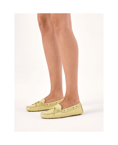 Gelbe Mokassins aus hochwertigem Naturleder sind ein energiegeladener Akzent, der Ihrem Styling Frische und Spaß verleihen wird. Ihr Obermaterial ist mit einem subtilen Riemen verziert, der durch den hinteren Teil des Schuhs gewebt ist und mit einer charmanten Schleife endet, die den Schuhen einen femininen Touch und Leichtigkeit verleiht. Der traditionelle Saum an der Vorderkappe unterstreicht den klassischen Stil und die sorgfältige Verarbeitung. Die flexible Stollensohle garantiert einen guten Halt und Komfort, passt sich der Fußform an und bietet den ganzen Tag lang Bequemlichkeit. Ein Gummieinsatz an der Ferse schützt den Schuh vor mechanischen Beschädigungen, die zum Beispiel beim Autofahren auftreten können.Die geformte Komfortsohle mit Perforationen besteht aus Semianilin-Schafsleder, das sich durch ein hohes Maß an Feuchtigkeitsaufnahme auszeichnet.