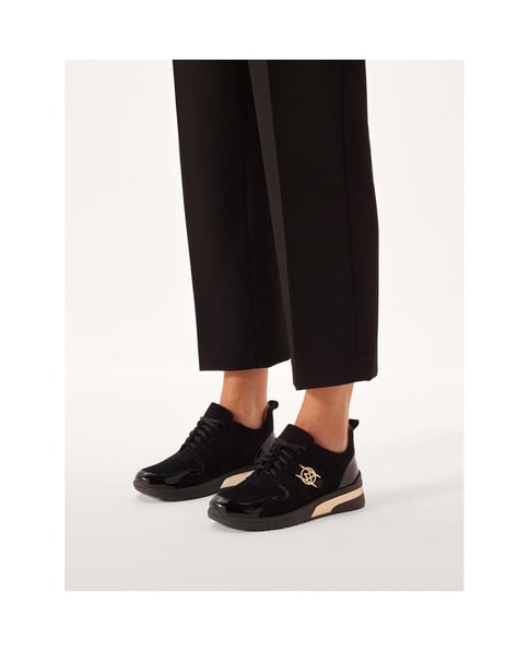 Die schwarzenSneaker aus Wildleder und Lackleder haben ein elegantes Obermaterial zum Schnüren und eine erhöhte Sohle. Das klassische Schwarz wird durch ausdrucksstarke Elemente in Goldfarbe durchbrochen. Die Sneakers im Casual-Stil sind die perfekte Ergänzung zum Alltagsstyling. Du kannst sie erfolgreich mit einem Sportanzug für die Arbeit und einem Trainingsanzug-Set für die Stadt tragen.Das Innere des Schuhs ist mit semianilinem Ziegenleder gepolstert und garantiert hygienische Bedingungen und hohen Komfort.