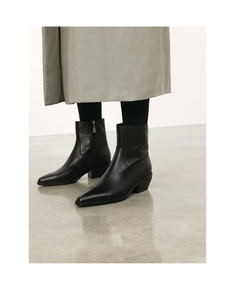 Klassische Cowboystiefel aus hochwertigem Naturleder sind die perfekte Kombination aus rauem Westernstil mit Eleganz und zeitloser Ästhetik. Glattes, sorgfältig gegerbtes Leder unterstreicht den luxuriösen Look des Schuhwerks, während die solide Verarbeitung Langlebigkeit und Tragekomfort garantiert. Der gerade Schaft, der bis hinter den Knöchel reicht, ist mit einem praktischen Reißverschluss ausgestattet, der das Anziehen erleichtert und für einen perfekten Sitz am Bein sorgt. Der für Cowboys charakteristische, abgeschnittene Absatz und die profilierte Sohle unterstreichen das originelle Design und verleihen den Schuhen Dynamik und Stabilität. Die verlängerte Nase verschlankt den Fuß optisch und verleiht dem Ganzen eine dezente Eleganz. Durch den universellen Schnitt und das tiefe Schwarz passen die Cowboystiefel sowohl zu Jeans, Lederhosen als auch zu luftigen Kleidern und verleihen dem Styling einen leicht lässigen, rockigen Charakter.Das Futter aus weichem Semianilin-Schafsleder g
