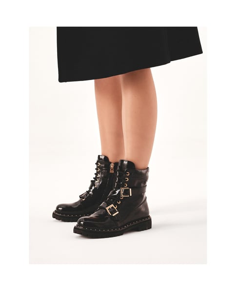 Schwarze Ankle Boots mit Schaft sind eine einzigartige Kombination aus Klassikern und modernen Details. Die glänzende Lacklederoberfläche verleiht Eleganz und Raffinesse und macht sie zu einer idealen Wahl für eine Vielzahl von Outfits. Der knöchellange Schaft ist mit Riemen verziert, die in stilvollen Schnallen enden, die ein attraktives dekoratives Element darstellen. Sie sind so angeordnet, dass sie die dynamische Linie des Schuhs unterstreichen. Die Sohle bietet einen guten Halt, was besonders in den Herbst- und Wintermonaten wichtig ist. Diese Stiefel sind die perfekte Ergänzung zu einem modischen urbanen Look. Das Futter aus weichem Schafsfell garantiert einen hohen Tragekomfort, während das Futter aus Stoffpelz an kälteren Tagen für ein Gefühl der Wärme sorgt.