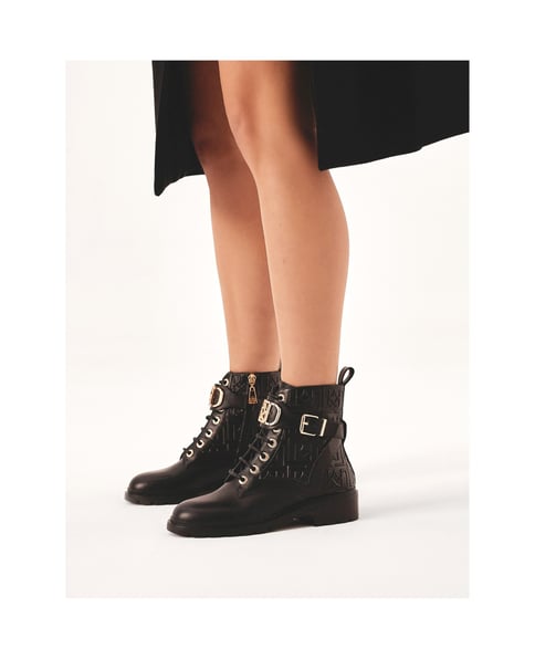 Die Damenstiefel aus Naturleder zeichnen sich durch einzigartige Details aus, die ihnen einen unverwechselbaren Charakter verleihen. Das Leder ist mit feinen geprägten Monogrammen verziert, die in einem interessanten Muster angeordnet sind. Ein zusätzliches, sehr markantes Element ist die Schnallenlasche mit einem großen goldfarbenen Metallmonogramm, das einen auffälligen Akzent setzt und den Schuhen einen noch exklusiveren Look verleiht. Das Obermaterial verfügt über eine praktische Schnürung, mit der sich der Schuh genau an den Fuß anpassen lässt, sowie über einen Reißverschluss zum einfachen An- und Ausziehen. Dank der reichhaltigen Verzierungen und des klassischen Designs eignen sich die Stiefel für eine Vielzahl von Anlässen, von alltäglichen Ausflügen bis hin zu besonderen Anlässen, bei denen man mit raffiniertem Stil beeindrucken möchte.Das Futter aus weichem Schafsleder garantiert hohen Tragekomfort, während das Futter aus Stoffpelz an kalten Tagen für ein Gefühl der Wärme sorg