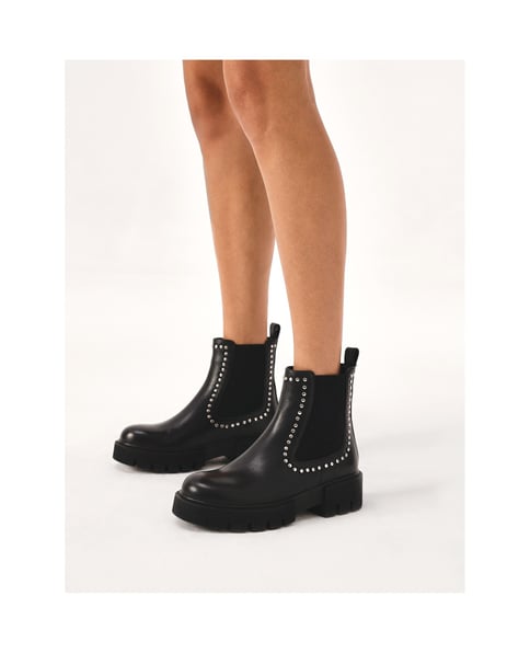 Die klassischen schwarzen Chelsea-Boots aus Leder sind eine elegante und vielseitige Wahl für alle, die sowohl Stil als auch Komfort schätzen. Dieses Modell verfügt über eine solide Sohle, die für hervorragenden Halt und angenehmen Tragekomfort sorgt. Der schlichte Schaft ist mit silbernen Metallnieten verziert, die ihm einen modernen Touch verleihen und ihn auszeichnen. Diese Chelsea-Boots sind perfekt für eine Vielzahl von Outfits.Das Futter aus Semianilin-Schafsleder sorgt dank seiner hervorragenden feuchtigkeitsabsorbierenden Eigenschaften für außergewöhnlichen Komfort.