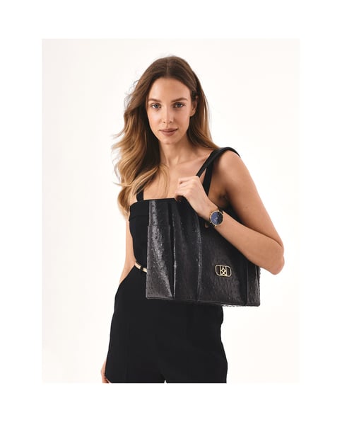 Eine große, geräumige Umhängetasche aus hochwertigem Leder mit Straußenmusterprägung in eleganter Trapezform. Die Struktur des Leders verleiht ihr einen einzigartigen Charakter und kombiniert einen luxuriösen Look mit einem modernen Stil. Bei der Gestaltung der Tasche wurde auf Funktionalität geachtet - an den Seiten befinden sich offene Fächer für den schnellen Zugriff auf kleine Gegenstände wie Telefon oder Schlüssel. Dank der breiten Griffe lässt sich die Tasche bequem über der Schulter tragen, und das geräumige Innere bietet viel Platz für die wichtigsten Dinge des Alltags, was sie zur idealen Wahl sowohl für die Arbeit als auch für gesellschaftliche Anlässe macht.Einzelheiten zum Produkt:Die Handtasche hat ein Hauptfach mit 3 Fächern, von denen 2 mit einem Schnappverschluss und 1 mit einem Reißverschluss geschlossen werden.Das mittlere Fach hat 1 Reißverschlussfach und 1 offenes Fach.Es gibt offene Taschen an den Seiten der Tasche.
