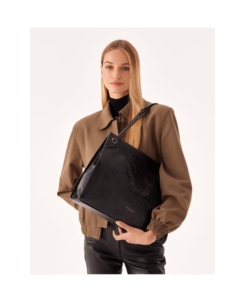 Eine große Damentasche aus hochwertigem Leder mit Krokodilprägung ist eine elegante Wahl für aktive Frauen. Der geräumige Innenraum garantiert Platz für viele Dinge des täglichen Bedarfs, und das stilvolle Design garantiert einen modischen Look. Schwarzes Leder kombiniert mit Rotguss-Elementenwirkt geschmackvoll und attraktiv.Details zum Produkt:Die Handtasche hat 1 Hauptfach mit Magnetverschluss.Im Inneren des Fachs befinden sich 2 offene Fächer und 1 Fach mit Reißverschluss.Die mit einer Kette verzierten Griffe ermöglichen es, die Tasche über der Schulter zu tragen.