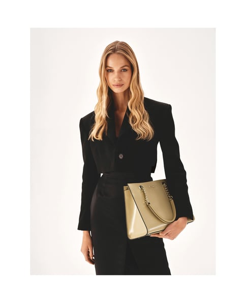 Diebeigefarbene Handtasche aus hochwertigem Narbenleder besticht durch ihre elegante Form und ihr modisches Design. Das glatte Leder und die klassische Farbe machen dieses Modell einzigartig und originell. Der minimalistische Schnitt wird durch goldene Beschläge und dicke Ketten an den Henkeln bereichert. Die steife Handtasche sieht unabhängig von ihrer Trageweise und ihrem Inhalt immer tadellos aus.Produkt-Details:Die Handtasche hat 1 Hauptfach, das mit einem Reißverschluss geschlossen wird.Im Inneren befinden sich 1 Reißverschlussfach und 1 offenes Fach.An der Unterseite der Tasche befinden sich Metallfüße.Hand- und Schultergriffe sind mit Metallketten verziert.