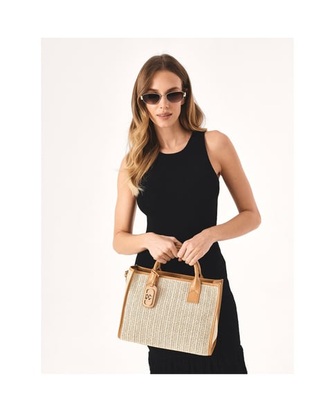 Mit ihrer regelmäßigen und starren Form ist die Tasche ein elegantes Modell, das modernes Design mit Funktionalität verbindet. Sie ist aus beigem Synthetikmaterial mit Flechtmuster gefertigt und zieht mit ihrer Textur und ihrem unverwechselbaren Look die Aufmerksamkeit auf sich. Elemente aus hellbraunem Naturleder, wie Riemen, Griffe und Randabschlüsse, verleihen der Tasche Klasse und unterstreichen ihren luxuriösen Charakter. Dank der stabilen Konstruktion bleibt die Tasche formstabil und bietet ein großes Fassungsvermögen, das ideal für den täglichen Gebrauch ist. Der stilvolle Tote Bag-Schnitt macht die Handtasche zu einer praktischen und eleganten Wahl, die sich sowohl für die Arbeit als auch für den Freizeitgebrauch eignet.Einzelheiten zum Produkt:Die Tasche hat 1 Hauptfach, das mit einem Reißverschluss geschlossen wird.Sie verfügt über 1 Reißverschlussfach und 2 offene Fächer.Die Tasche ist mit Griffen, einem breiten, nicht verstellbaren Riemen und einem dünnen, verstellbaren Rie