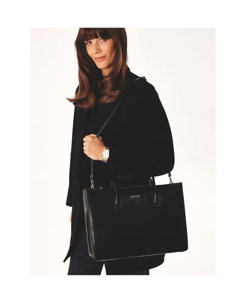Wir präsentieren einen absoluten Klassiker in der Welt der Business-Accessoires - eine schlichte, minimalistische Handtasche, die Eleganz und Professionalität ausstrahlt. Aus hochwertigem Naturleder in einem tiefen Schwarzton gefertigt, ist sie eine ausgezeichnete Wahl für alle, die Stil und Funktionalität schätzen. Ihr Design basiert auf einfachen geometrischen Formen, was ihr einen raffinierten und modernen Look verleiht. Ohne unnötige Verzierungen und Details konzentriert sich die Handtasche auf die Essenz der Eleganz, was sie zu einer idealen Wahl für das Büro oder Geschäftstreffen macht. Dank der großen Griffe lässt sie sich bequem tragen, während der abnehmbare lange Riemen die Möglichkeit bietet, die Handtasche über der Schulter zu tragen und sie so an Ihre persönlichen Vorlieben und Bedürfnisse anzupassen.Einzelheiten zum Produkt:Die Handtasche hat ein Hauptfach, das mit einem Reißverschluss geschlossen wird.Sie verfügt über 1 offenes Fach und 1 Fach mit Reißverschluss.Der Gurt
