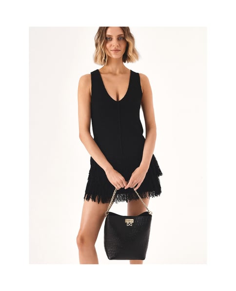 Diese schwarze Handtasche mit goldfarbener Zierschließe ist ein luxuriöses und raffiniertes Accessoire, das mit seinem einzigartigen Stil die Aufmerksamkeit auf sich zieht. Sie ist aus hochwertigem Leder mit Straußenhautprägung gefertigt und hat eine elegante, strukturierte Oberfläche, die ihr eine exklusive Note verleiht. Die Tasche ist mit zwei Arten von Griffen ausgestattet, was sie zu einem vielseitigen Accessoire macht. Mit einer kurzen, dekorativen Kette kann die Handtasche in der Hand getragen werden, was ihr einen eleganten, abendlichen Touch verleiht, der perfekt für formellere Anlässe ist. Mit dem langen, abnehmbaren Riemen kann die Tasche auch über der Schulter oder über dem Arm getragen werden, was sie auch im Alltag bequem macht.Einzelheiten zum Produkt:Die Handtasche hat 1 Hauptfach, das mit einem Scharnierverschluss geschlossen wird.Sie hat einen eingenähten Reißverschlusseinsatz aus Stoff.Die Tasche hat 1 offenes Fach und 1 geschlossenes Fach.Die Handtasche ist mit Meta