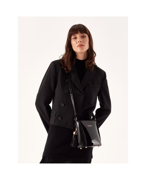 Die kleine Handtasche ist ein klassischer, zeitloser Schnitt in einem eleganten Design. Sie ist aus hochwertigem Lackleder gefertigt, das für ein ästhetisches Erscheinungsbild und Langlebigkeit sorgt. Der schlichte Schnitt ist mit goldener Hardware und einem Anhänger in Form eines Schlüsselrings verziert. Zahlreiche Fächer, die längliche Form und das universelle Schwarz machen die Kuriertasche zu einer unverzichtbaren Ergänzung für viele Stylings. Sie wird zweifellos von einer Frau geschätzt werden, die jeden Tag stilvoll aussehen möchte.Einzelheiten zum Produkt:1 Hauptfach, das mit einem Reißverschluss geschlossen wird.Im Inneren des Fachs 1 offenes Fach und 1 Fach mit Reißverschluss.An den Seiten 2 Taschen mit Reißverschlüssen.Auf der Rückseite 1 Tasche mit Reißverschluss.Dekorativer Zapfen am Reißverschlussgriff.Nicht abnehmbarer, verstellbarer Gurt.Die Tasche ist mit Metallfüßen ausgestattet.