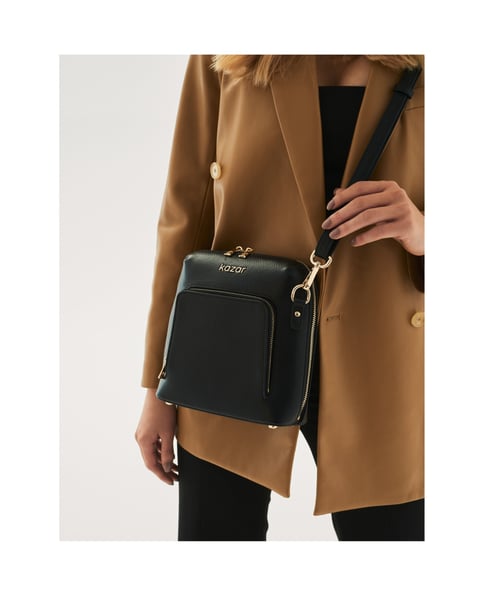 Schwarze Damentasche aus hochwertigem genarbtem Leder, ein praktisches Modell im lässigen Stil.Perfekte Lederqualität, kombiniert mit einer präzisen Verarbeitung, schafft ein Produkt der Spitzenklasse.Schwarz lässt sich leicht mit allen Alltagsstilen kombinieren.Ein einzigartiges und vielseitiges Design, ausgestattet mit kleinen Kartenfächern.Eine faszinierende Komposition, die durch ein goldenes KAZAR-Logo veredelt wird.Mit Reißverschluss zu schließen.Produkt-Details:Diese Tasche hat 1 Hauptfach mit Reißverschluss.Sie verfügt über ein Fach mit 24 Kartenfächern, 1 Reißverschlussfach und 2 offene Fächer.Eine große Reißverschlusstasche befindet sich auf der Vorderseite der Tasche.Die Tasche ist mit Metallfüßen ausgestattet.Der Gurt ist abnehmbar und verstellbar.