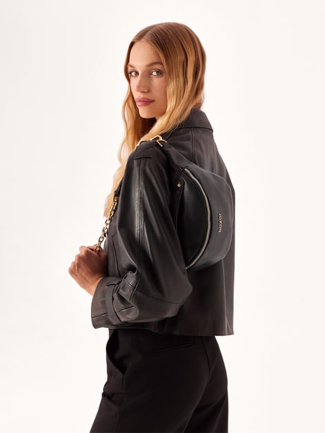 Die Hüfttasche aus hochwertigem Narbenleder in schwarzer Farbe ist praktisch und vielseitig. Der mit einer goldfarbenen Metallkette verzierte Riemen sieht schön über die Schulter gehängt aus. Das besondere Element dieser Hüfttasche ist ein kurzer Griff, so dass Sie sie in der Hand tragen können. Dieses stilvolle und interessante Accessoire bietet Platz für alle wichtigen Dinge und vor allem volle Bewegungsfreiheit.Einzelheiten zum Produkt:Die Hüfttasche hat 1 Fach, das mit einem Reißverschluss geschlossen wird.Im Inneren befindet sich 1 offenes Fach und 1 Fach mit Reißverschluss.Auf der Rückseite der Hüfttasche befindet sich 1 Tasche mit Reißverschluss.Der Kettenriemen ist abnehmbar und verstellbar.