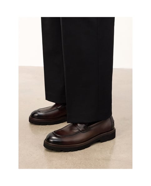 Halbschuhe im Loafer-Stil aus hochwertigem Naturleder sind ein klassischer Vorschlag mit zeitlosem Charakter. Das glatte Obermaterial in einem tiefen Braunton wurde mit viel Liebe zum Detail verarbeitet, und die charakteristische Zunge mit angenähtem Riemen verleiht dem Modell einen eleganten Ausdruck. Die abgerundete Schuhspitze und die feinen Nähte betonen die traditionelle Form des Schuhs und verleihen ihm gleichzeitig Vielseitigkeit. Auf einer soliden, robusten Sohle mit ausgeprägtem Profil vereinen diese Loafer Klassiker mit einem modernen Ansatz für Komfort und Funktionalität. Er ist die ideale Wahl für den Alltag, sei es für einen eleganten Freizeitlook oder für ein legeres Styling.Das Futter aus natürlichem Leder garantiert hohen Tragekomfort.