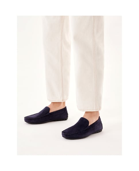 Die marineblauen Herren-Mokassins aushochwertigem Veloursleder sind ein klassischer Mokassin-Schnitt mit einer speziellen Überlappung an der Ferse, die sich hervorragend zum Fahren eignet. Ein interessanter Akzent dieses Modells ist das geprägte KAZAR-Logo an der Seite und das dreifarbige Band im Inneren des Schafts, das ihn vor Dehnung schützt. Die minimalistischen Mokassins passen nicht nur zu lässigen, sondern auch zu etwas formelleren Outfits.Der wohlgeformte Schaft und das weiche Schafslederfutter sorgen für ganztägigen Komfort.