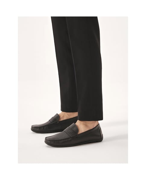 Die Herren-Mokassins aus hochwertigem , bedrucktem Leder mit dezentem Muster sind ein klassischer Schlupfschuh mit einem Faden und einem Zierriemen auf der Vorderseite. Die elastische Sohle macht das Gehen in diesen Schuhen zum reinen Vergnügen. Die Leichtigkeit, mit der sie angezogen werden können, und die Möglichkeit, sie barfuß zu tragen, werden von Männern geschätzt, die praktische Lösungen mögen. Die universelle schwarze Farbe lässt sich mit Kleidung in allen Farben kombinieren.Das Lederfutter sorgt für hygienische Bedingungen für die Füße und für Komfort beim Tragen der Schuhe.