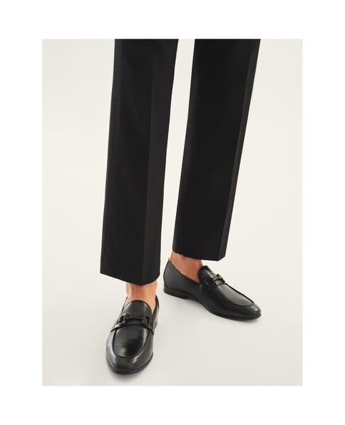 Minimalistische Slipper für Herren aus genarbtem Leder mit glatter Textur sind ein Klassiker, der nie aus der Mode kommt. Der schmale Schaft zum Hineinschlüpfen ist mit einem Metallteil verziert, das an das Zaumzeug eines Pferdes erinnert. Die schwarze Komposition ist äußerst vielseitig und kann daher in verschiedenen Sets kombiniert werden. Der besondere Vorteil der Slipper ist die Möglichkeit, sie barfuß zu tragen, weshalb sie eine interessante Basis für Outfits bilden.Der mit echtem Leder gefütterte Innenraum des Schuhs garantiert hygienische Bedingungen und hohen Tragekomfort.