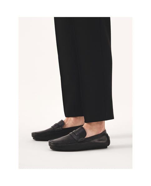 Schwarze Drivingmoccasins Mocs aus hochwertigem Naturleder sind die perfekte Kombination aus Komfort, Eleganz und lässigem Stil. Dieser Slipper zeichnet sich durch ein extrem bequemes und leichtes Design aus, das sowohl für den Alltag als auch für zwanglosere Anlässe perfekt ist. Das Obermaterial der Schuhe ist glatt, und das natürliche Leder verleiht ihnen einen dezenten Glanz und Strapazierfähigkeit, was diese Mokassins zu einer idealen Wahl für viele Jahreszeiten macht. Auf der Vorderseite des Schafts befindet sich ein markanter Gürtel mit einem Schnitt, der ein klassisches Element dieser Art von Schuhen ist und den Schuhen einen zeitlosen Charme verleiht. Der von Hand gefertigte Saum auf der Vorderseite des Schuhs unterstreicht den traditionellen Stil und die Handwerkskunst. Ein besonderes Merkmal der Driving Mocs ist die Ferseneinlage, die zusätzlichen Schutz beim Fahren bietet. Diese Auflage aus Gummi oder Leder garantiert einen besseren Halt und eine längere Lebensdauer in den B