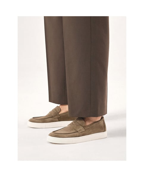 Die Herren-Sneakers in einem eleganten Taupe-Ton sind eine Kombination aus moderner Form und zeitlosem Stil. Sie sind aus hochwertigem, weichem Wildleder gefertigt und bieten nicht nur Strapazierfähigkeit, sondern auch Tragekomfort. Der Schaft zum Hineinschlüpfen, der mit einem dezenten Riemen mit zartem Loch verziert ist, verleiht dem Schuhwerk Chic und Leichtigkeit. Die schneeweiße Sohle kontrastiert mit dem neutralen Taupe-Ton und bildet eine besonders harmonische Komposition. Perfekt für den Alltag, für Männer, die diskrete Eleganz und Komfort in jeder Situation schätzen.Das Innenfutter aus Naturleder sorgt für Komfort und hygienische Bedingungen für die Füße.