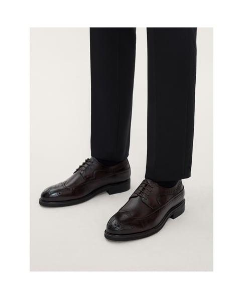 Braune Herrenschuhe aus hochwertigem Narbenleder fallen durch eine reiche, brogues-typische Rosettenverzierung auf. Eine überlappende Zehenkappe mit durchbrochener Verzierung und seitliche Nähte bereichern den schlichten Schaft eindrucksvoll. Durch die elegante Kombination mit rustikalen Elementen sind die Schuhe auch für weniger formelle Kombinationen geeignet. Bemerkenswert ist auch der offene Schaft, d.h. der Teil des Schafts an den Schnürsenkeln. Solche Lösungen erleichtern das An- und Ausziehen der Schuhe, besonders für Menschen mit einer hohen Fußhebung. Die präzise Verarbeitung und die hochwertigen Materialien sorgen dafür, dass die Schuhe auch den Geschmack der anspruchsvollsten Männer befriedigen. Das mit Schafsleder gefütterte Innere des Schuhs garantiert hygienische Bedingungen und außergewöhnlichen Komfort.