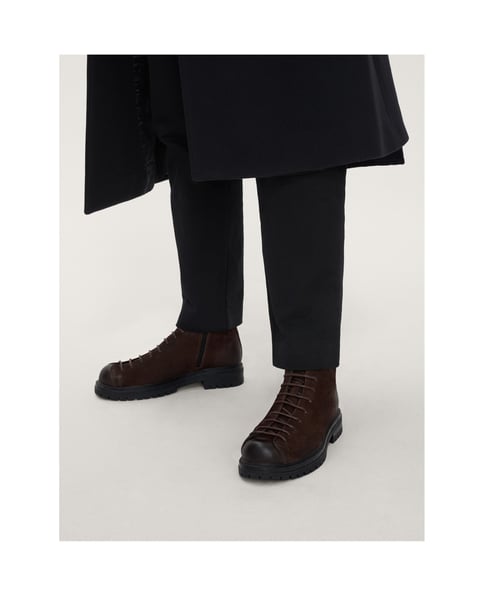 DieHerrenstiefeletten aus hochwertigem Nubukleder in brauner Farbe sind mit einem schlichten Schaft und einer bequemen Sohle ausgestattet. Was bei diesem Modell ins Auge sticht, ist die Schnürung, die an der Zehenkappe beginnt und die schlanke Linie des Schuhs betont. Schattiertes Leder unterstreicht perfekt die Farbtiefe. Die bequemen, vielseitigen Schuhe ohne Isolierung können das ganze Jahr über getragen werden.Das mit Schafsfell gefütterte Innere des Schuhs garantiert hygienische Bedingungen und hohen Komfort.